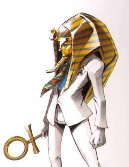 Anatel is a man of average height. He wears a pair of white dress pants and a white formal suit. Underneath it, he wears a light blue shirt and a green and red striped tie that is decorated with lines of Egyptian hieroglyphs. He wears simple white dress shoes with the golden tips similar to the chin decoration worn by the pharaoh.