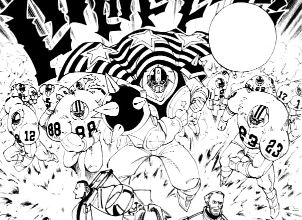 In battle, he wears a modified version of his old football uniform with spikes on his helmet and kneepads. His upper body is completely bare save for a pair of chest plates and spiked shoulder pads. He has stars on his gloves and wears a cape with patterns similar to the American flag.