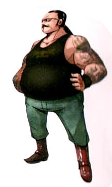 He has black hair that is tied in a ponytail, a mustache, and lots of tattoos on his arms. He wears black sunglasses, a black tank top, jeans, and brown boots.