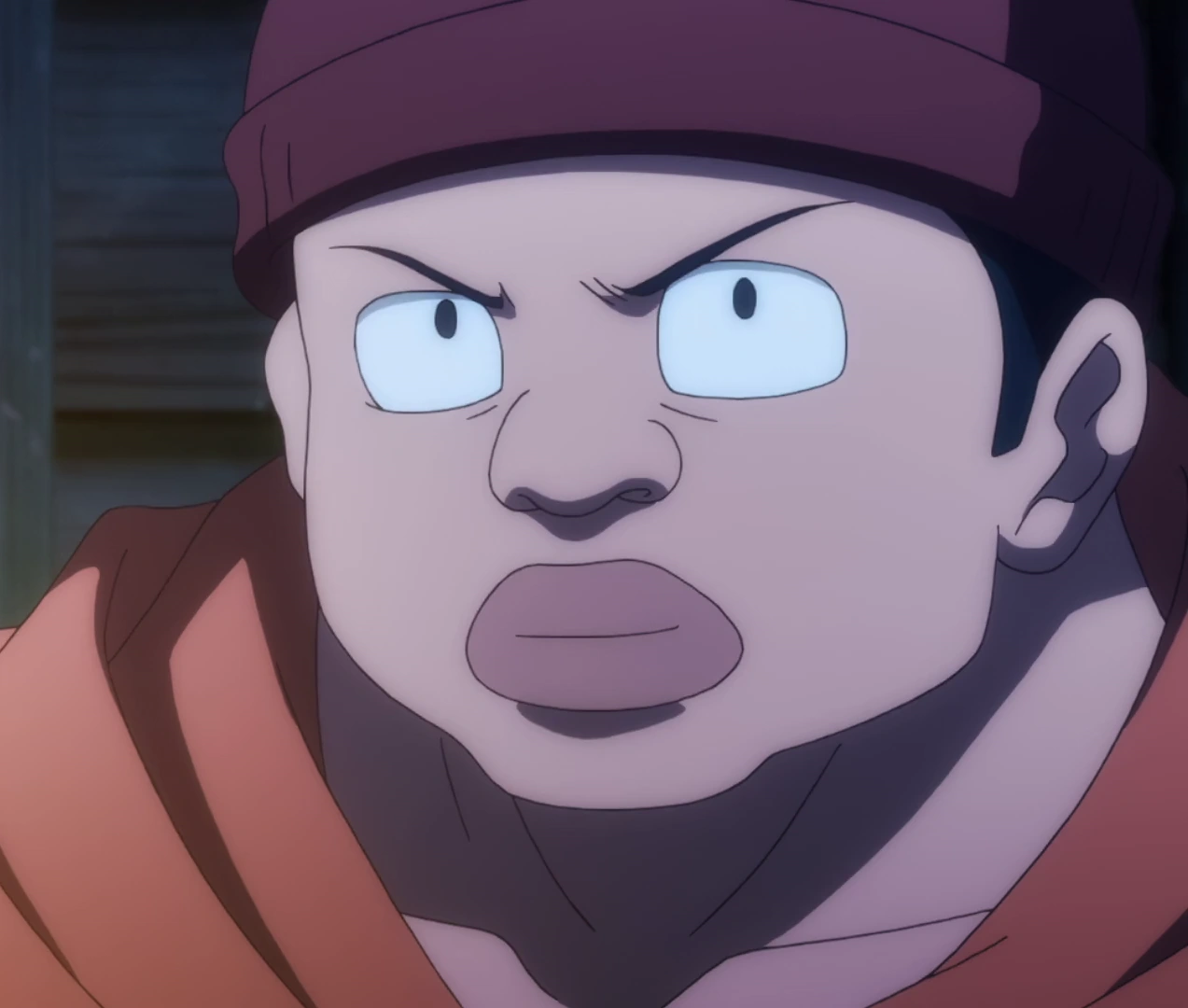 Muscle Punch wears a red wool hat, shorts and an orange jacket with an M on the left sleeve.