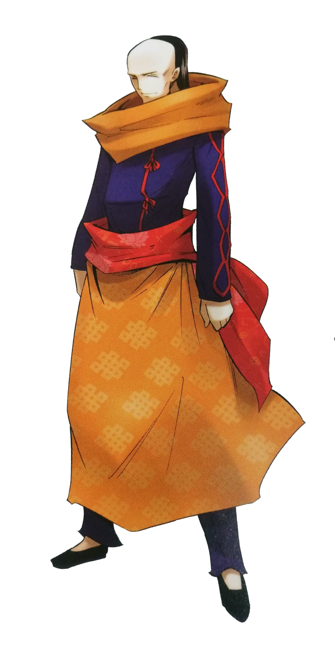 Sei-Kyow is a man who wears a dark Chinese style shirt and trousers, with a large orange scarf around his neck and a long orange skirt over his trousers with a red sash. Most of his head is bald, save a long black ponytail.